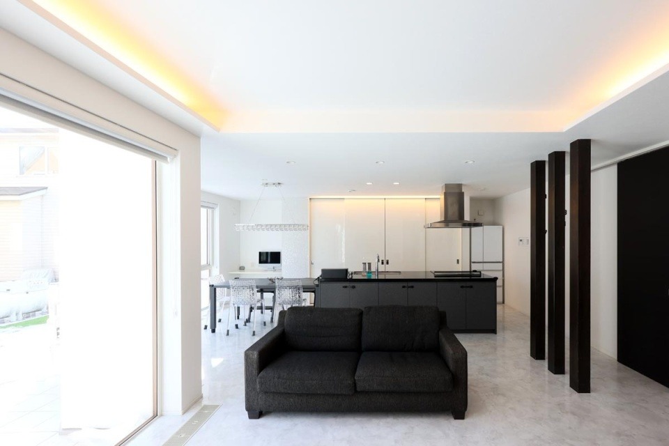 「モダン」をコンセプトに、白を主体としたシンプルな空間にまとめた苫小牧のO邸。LDKは26.25帖という広さで、大理石調のフロアタイルや白で統一した内装がホテルのような印象を与えています。