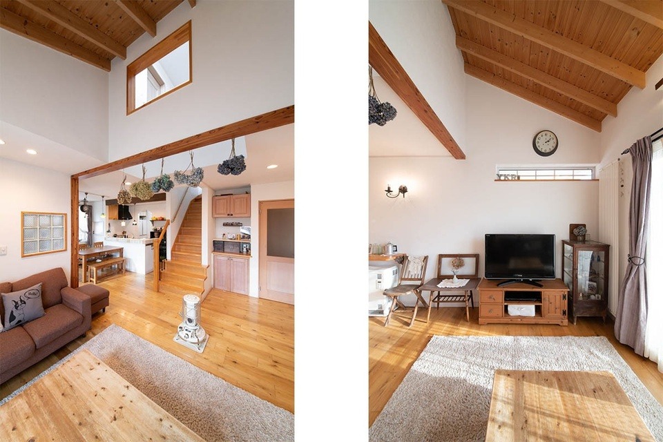 SHS外張断熱工法のメリットをリビングでも最大限に活かしており、高い天井や屋根形状を生かした空間構成でも室内は年中快適な温度を保ちます。