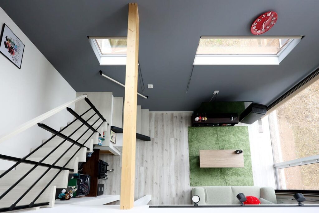 梁は構造上必要なため残しましたが、高窓からの日射と高い天井が組み合わさり、明るさと開放感が格段に高まりました。さらに、玄関ホールとリビングの間の壁を撤去し、スケルトン階段を採用したことで、帰宅した子どもたちの様子もリビングから見守れる間取りに。