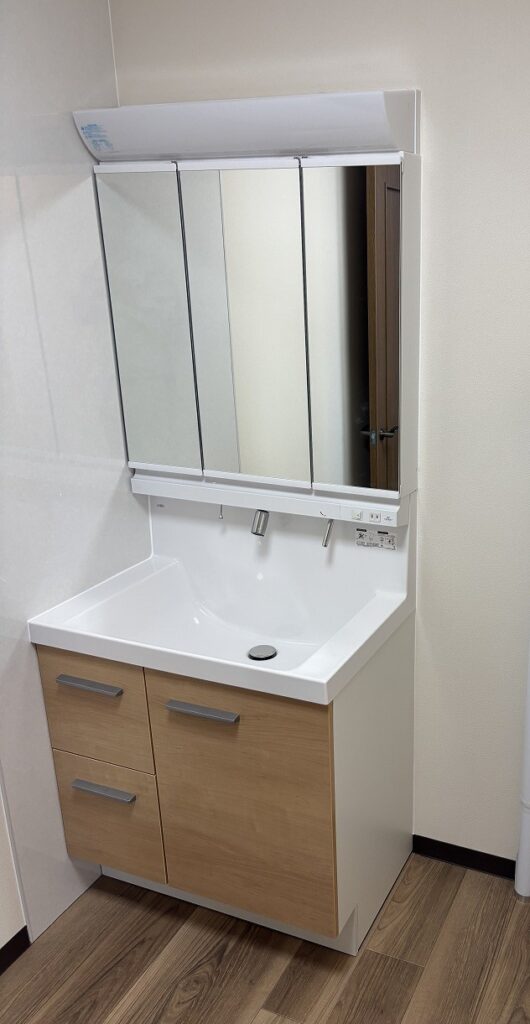洗面台はミラー裏が収納になっているタイプを採用。