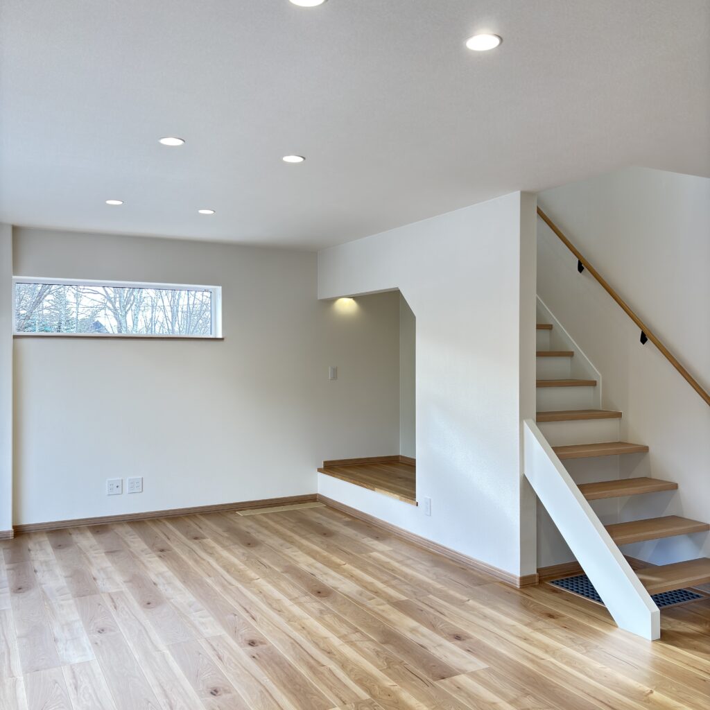 家族の集まる空間は、20帖以上の広々設計。階段の一部をオープン階段にすることで、リビングに圧倒的な開放感をもたらしています。明るい木目と白い壁が心地よい、広々としたLDKをぜひご体感ください。