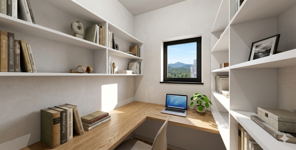 ◆自分時間の確保: 大容量ファミリークローゼットの奥にはご主人の書斎、キッチンの背後には奥様のワークスペース(ママルーム)を配置 。家族の気配を感じつつ、集中できる環境を両立しています 。