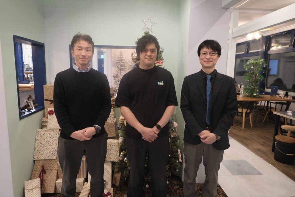 左から 当社設計部長安達章一郎、(株)サウザンド企画開発部菱一輝次長代理、当社専務巽佑太